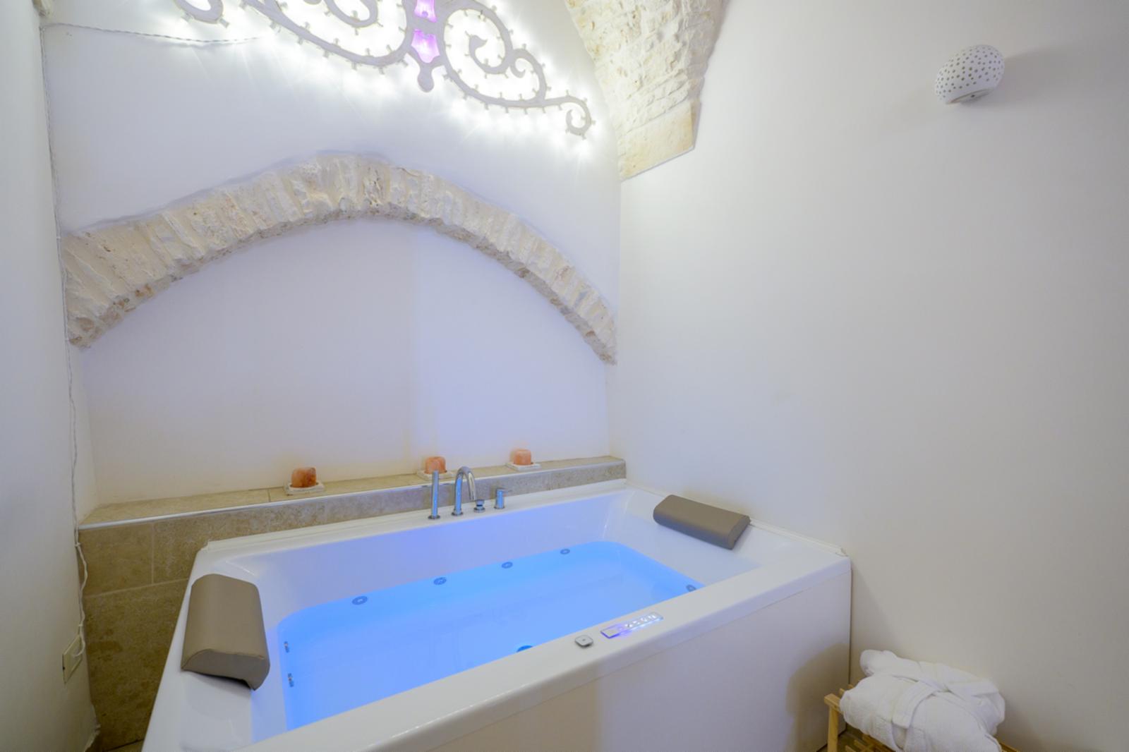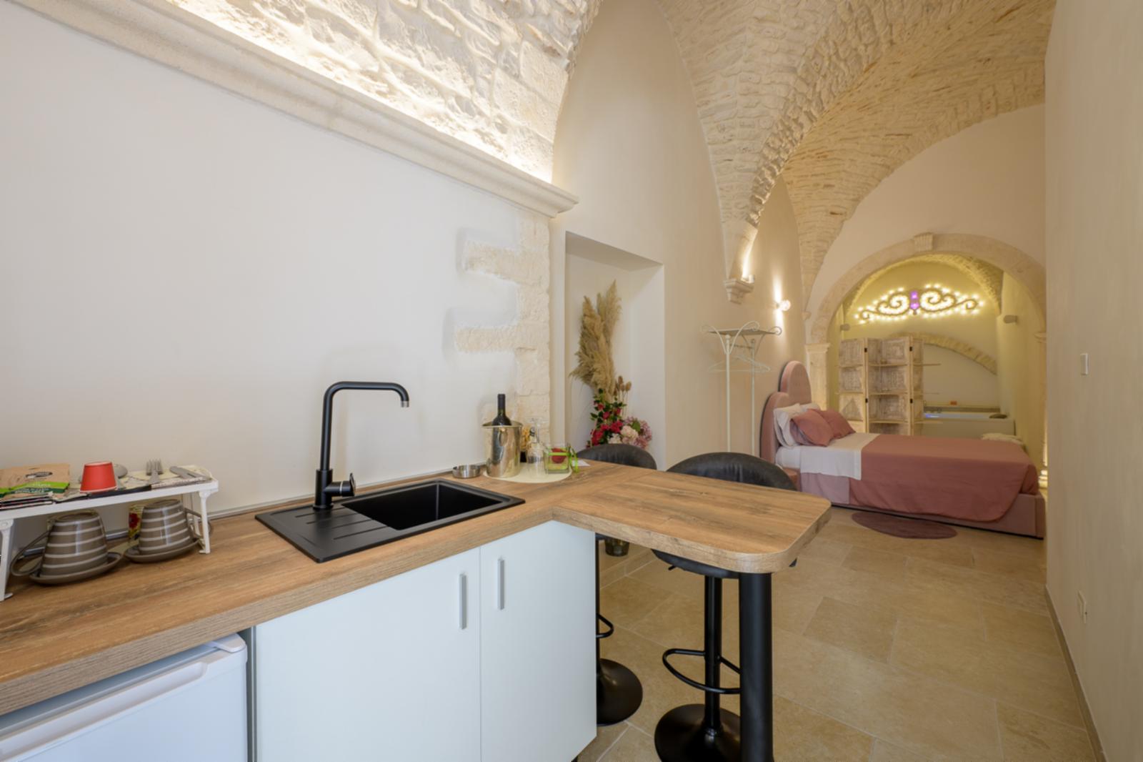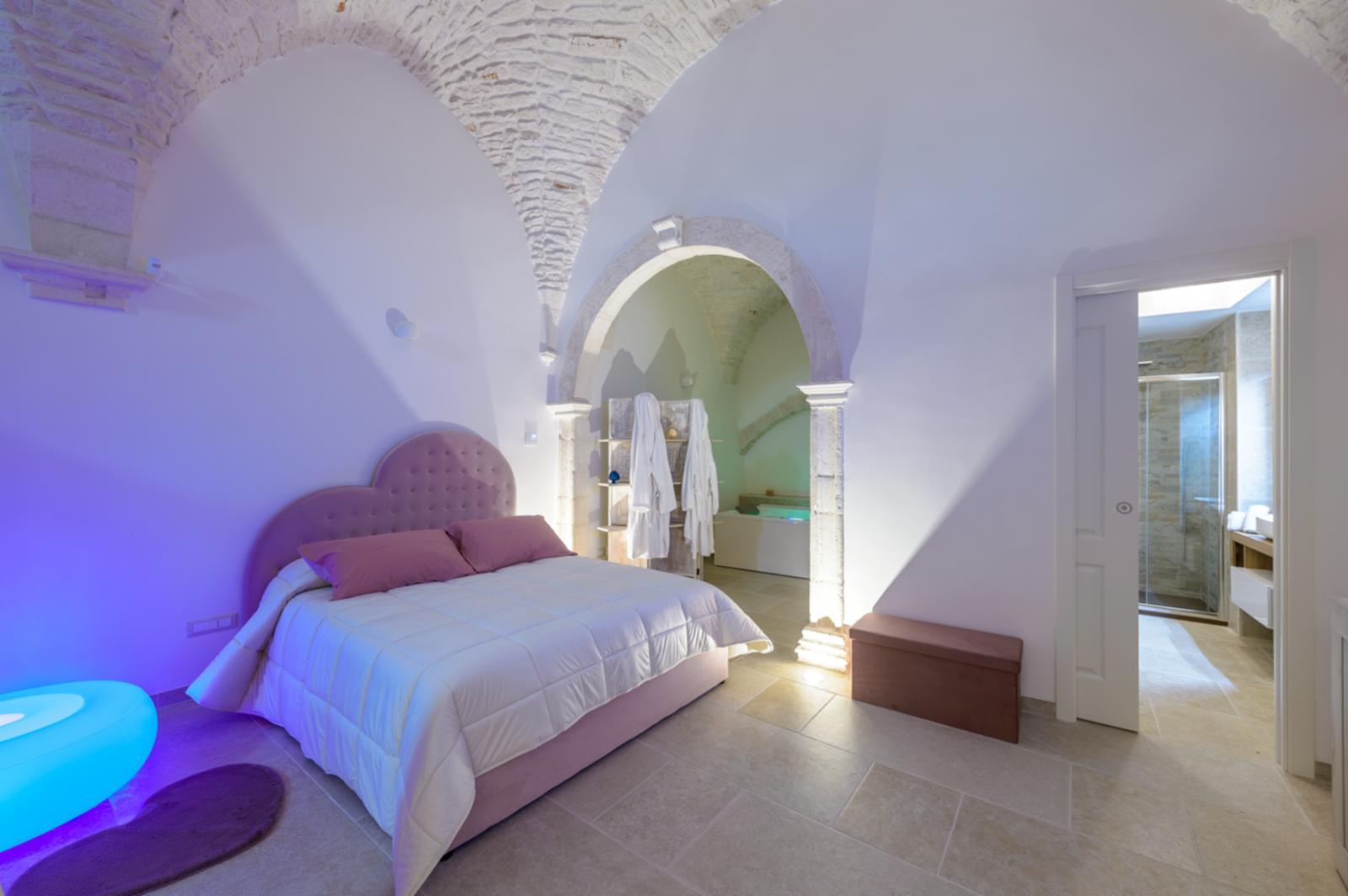 1. La camera “Suite”, ideale per una coppia, è composta da una stanza open space con letto matrimoniale, lavandino con isolotto, mini frigo, vasca idromassaggio e bagno privato. L’appartamento dispone di un impianto di riscaldamento e raffreddamento, macchina del caffè, smart tv, wi-fi gratuito e asciugamani per tutti gli ospiti. Colazione inclusa nel prezzo.