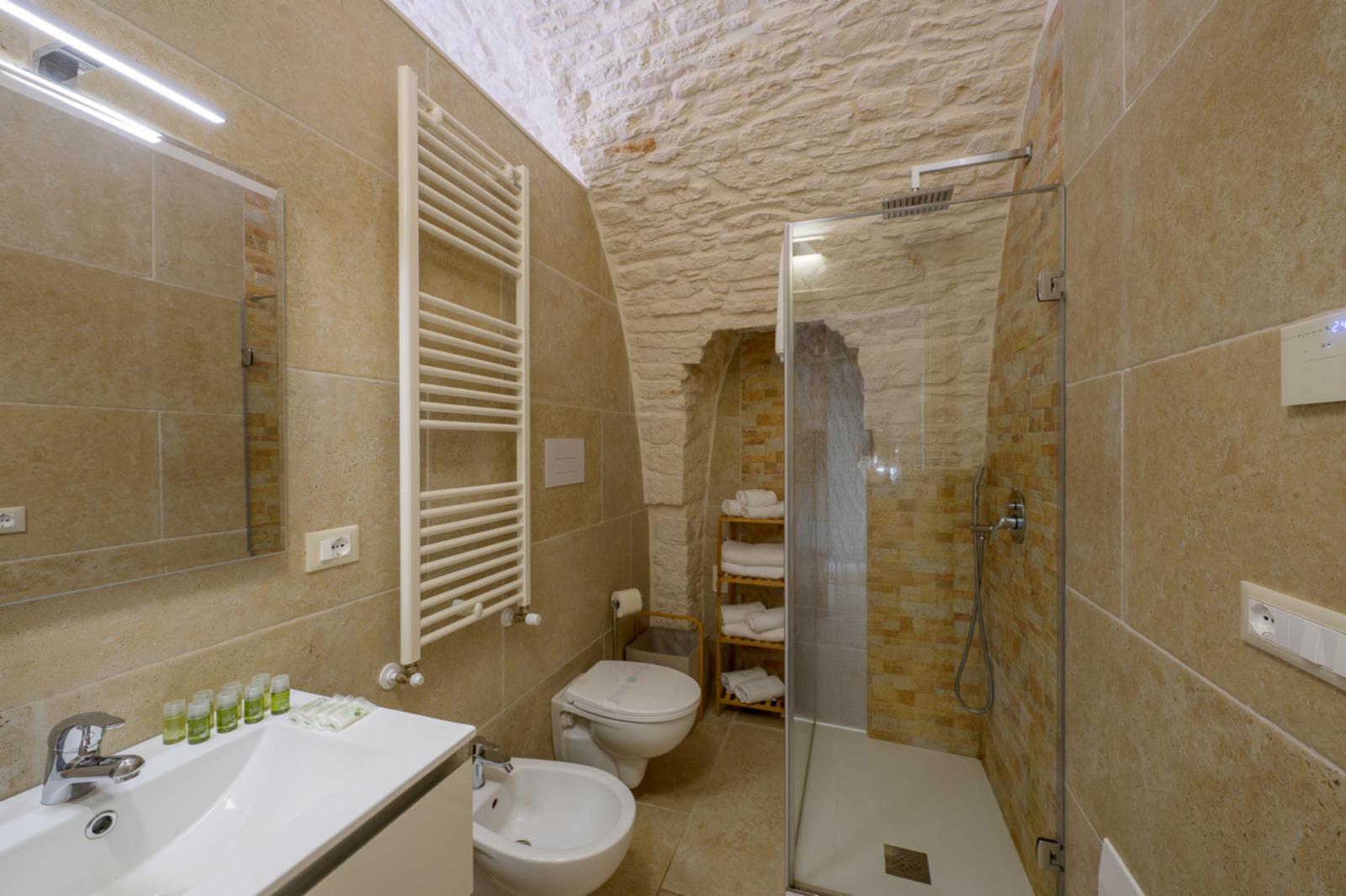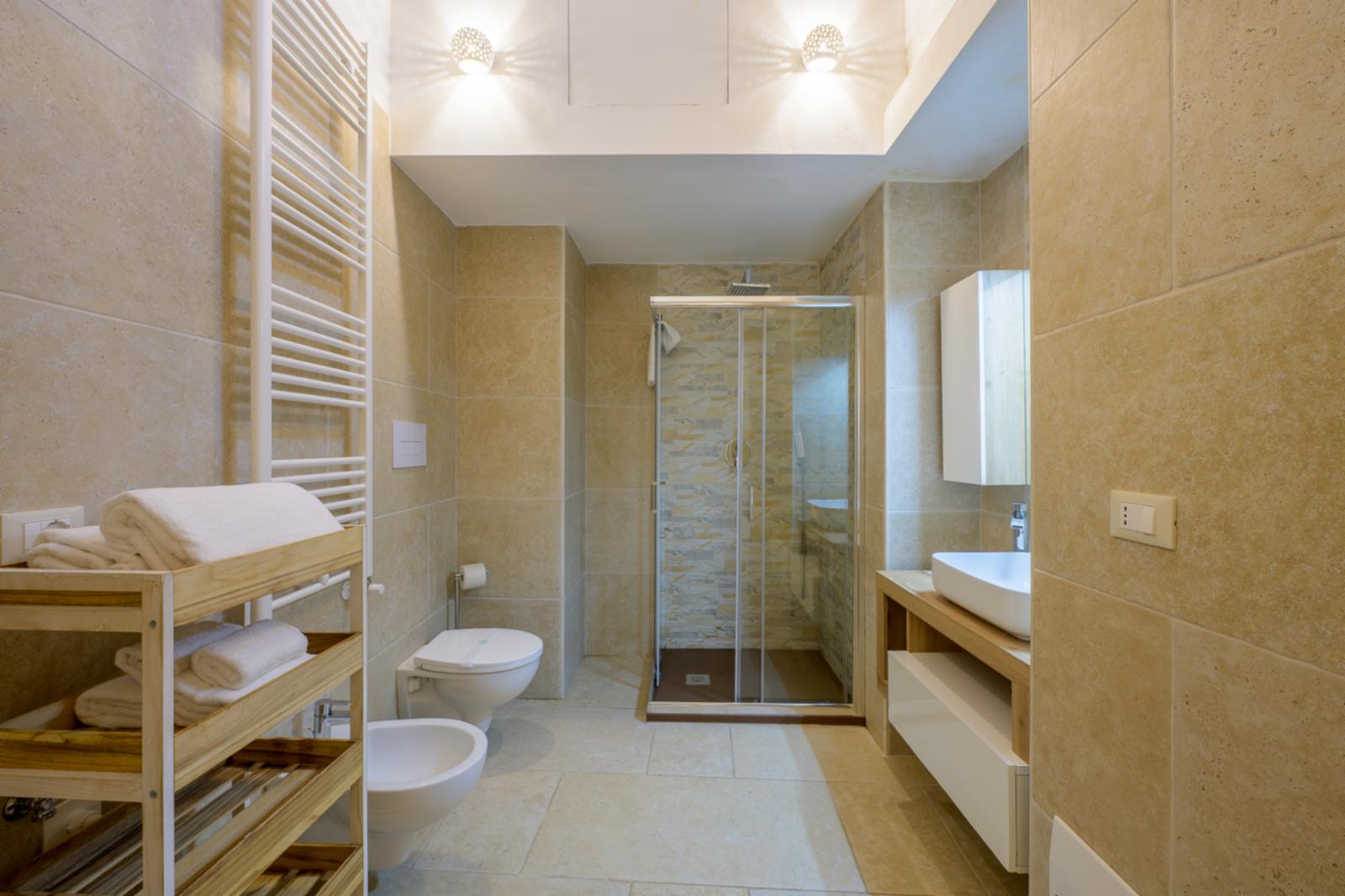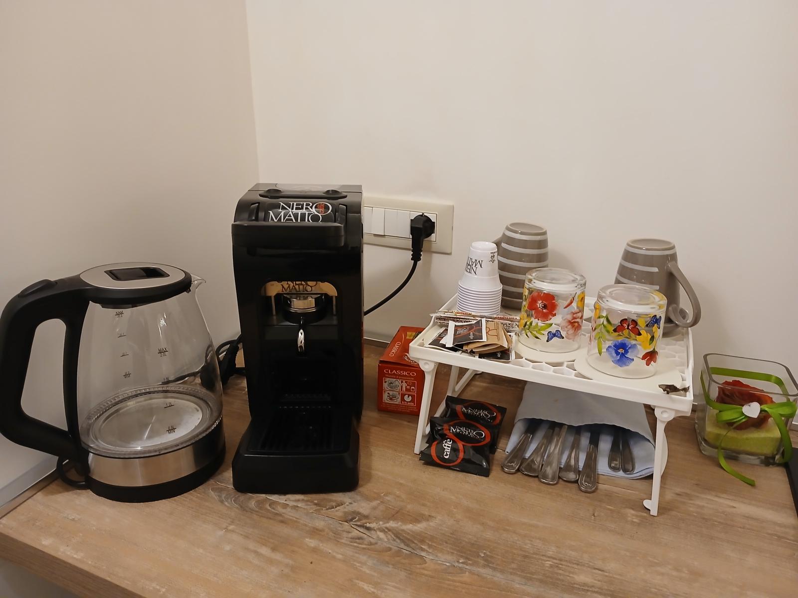 1. La camera “Suite”, ideale per una coppia, è composta da una stanza open space con letto matrimoniale, lavandino con isolotto, mini frigo, vasca idromassaggio e bagno privato. L’appartamento dispone di un impianto di riscaldamento e raffreddamento, macchina del caffè, smart tv, wi-fi gratuito e asciugamani per tutti gli ospiti. Colazione inclusa nel prezzo.