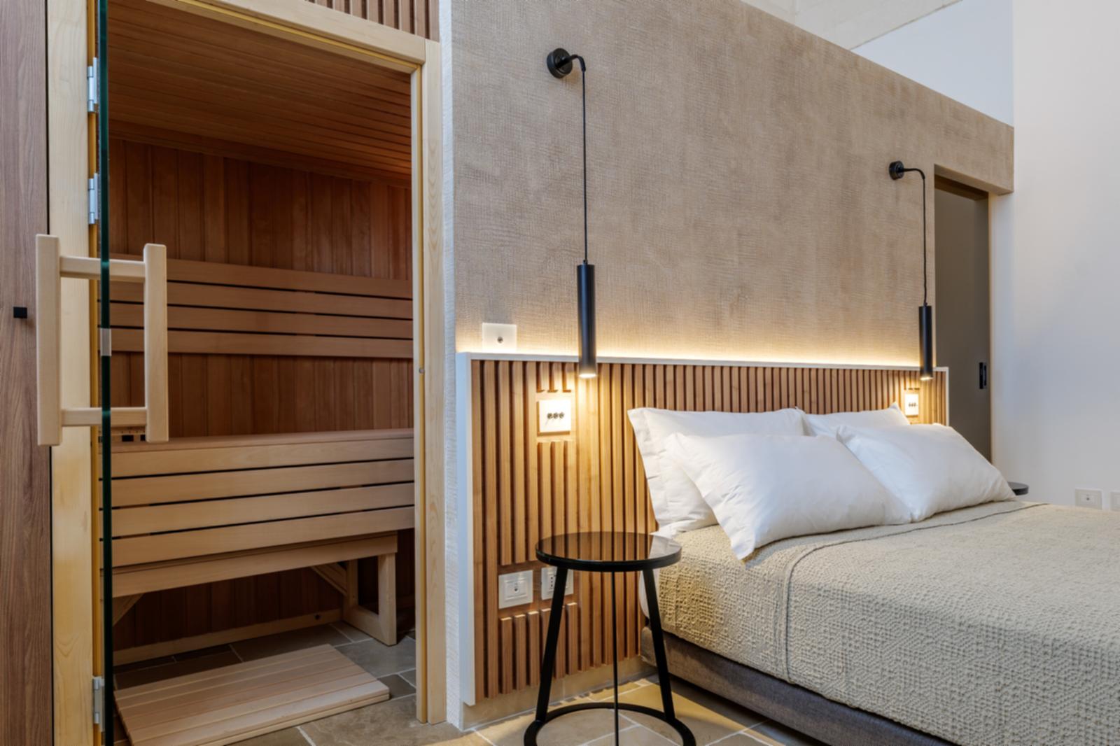 - The Giara room is an intimate and welcoming environment, designed to guarantee maximum comfort. Among its strengths, a private sauna for moments of complete relaxation and a large shower, perfect for regaining energy and well-being.